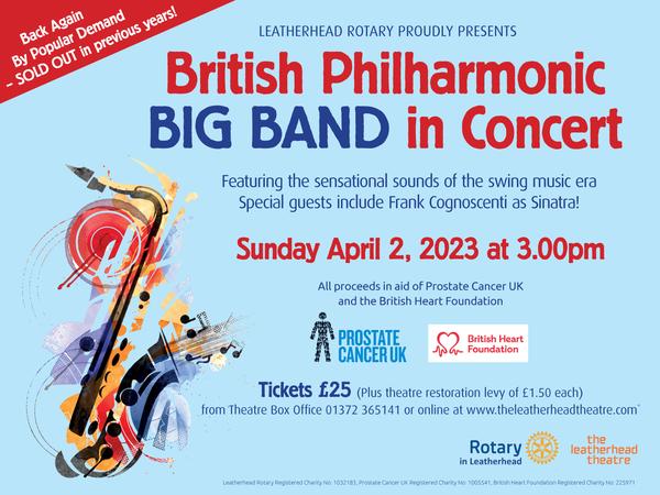 Leatherhead Rotary Club is again presenting its ever popular big band event to raise funds for Prostate Cancer UK and the British Heart Foundation. The band features 17 of the UK’s top professional jazz musicians playing
